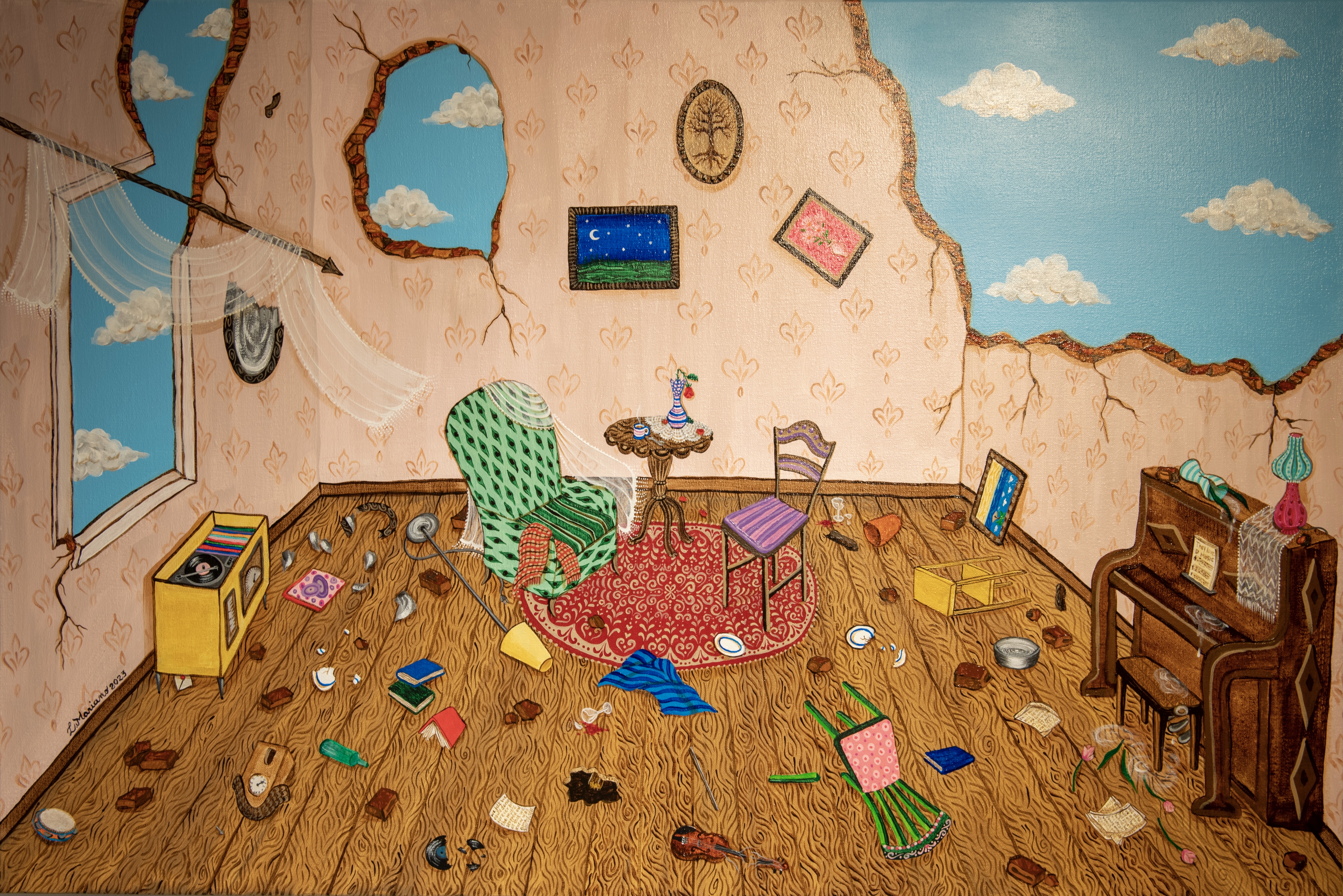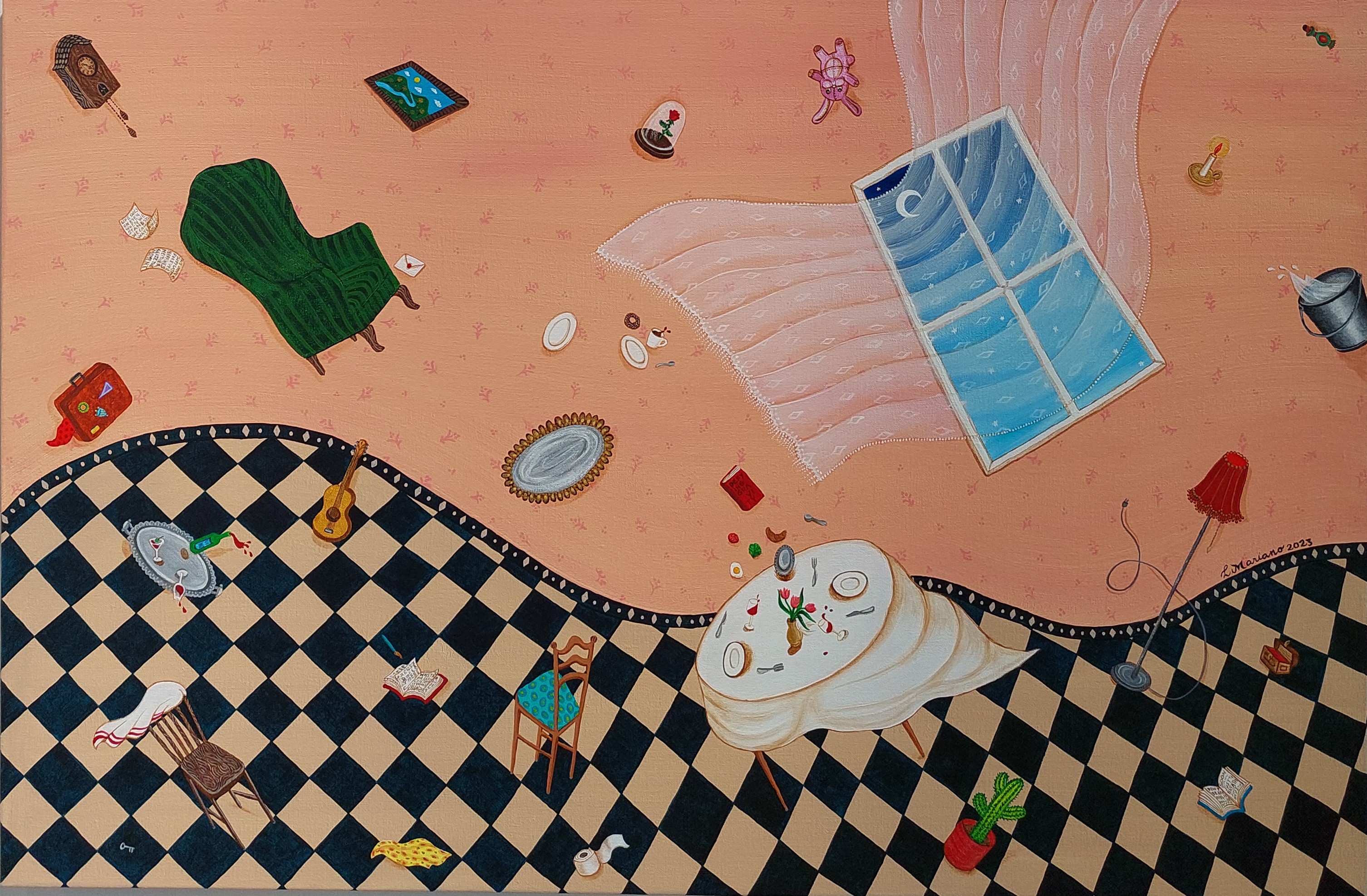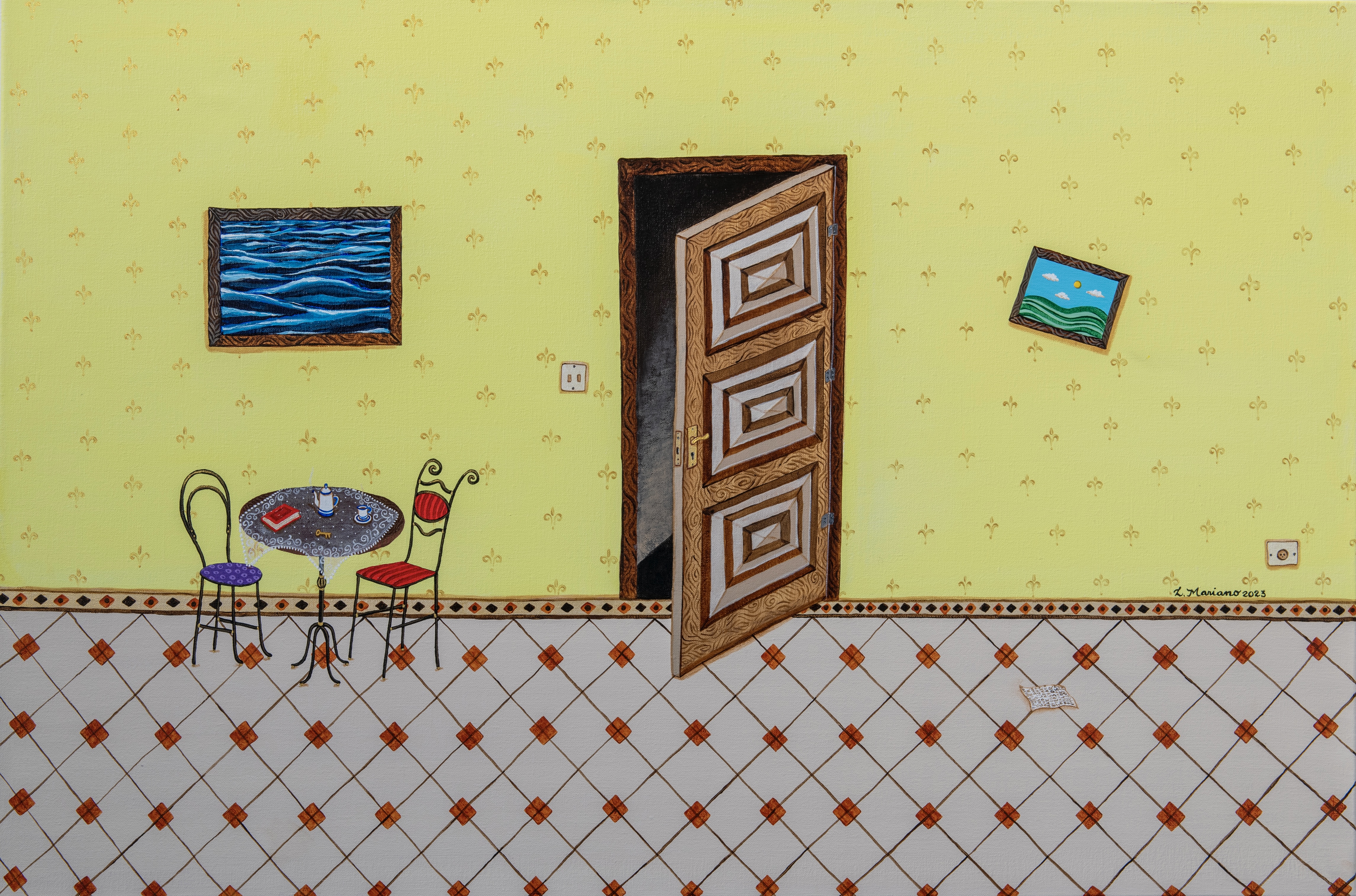 The 5th work of the immigration series is called “Finding balance”. Major life changes provoque unbalance. Immigrating requires a change of mind-set, search and understanding of the new reality. The new structure may seem confusing and the ways to function in society may need adjustments. Language, culture, clima, everything will challenge your adaptability. The door is half open and you never know what it may hold behind it. The scene is simple; door, table, different chairs where perhaps one can sit for a while and find some guidance or figure out the silence. On the walls 2 paintings: the waters look straight while the firm ground looks unbalanced. Small details and overwhelming feelings. All stages of a major change or immigration is a vast and uncomfortable ecossistem of feelings. Can you relate?