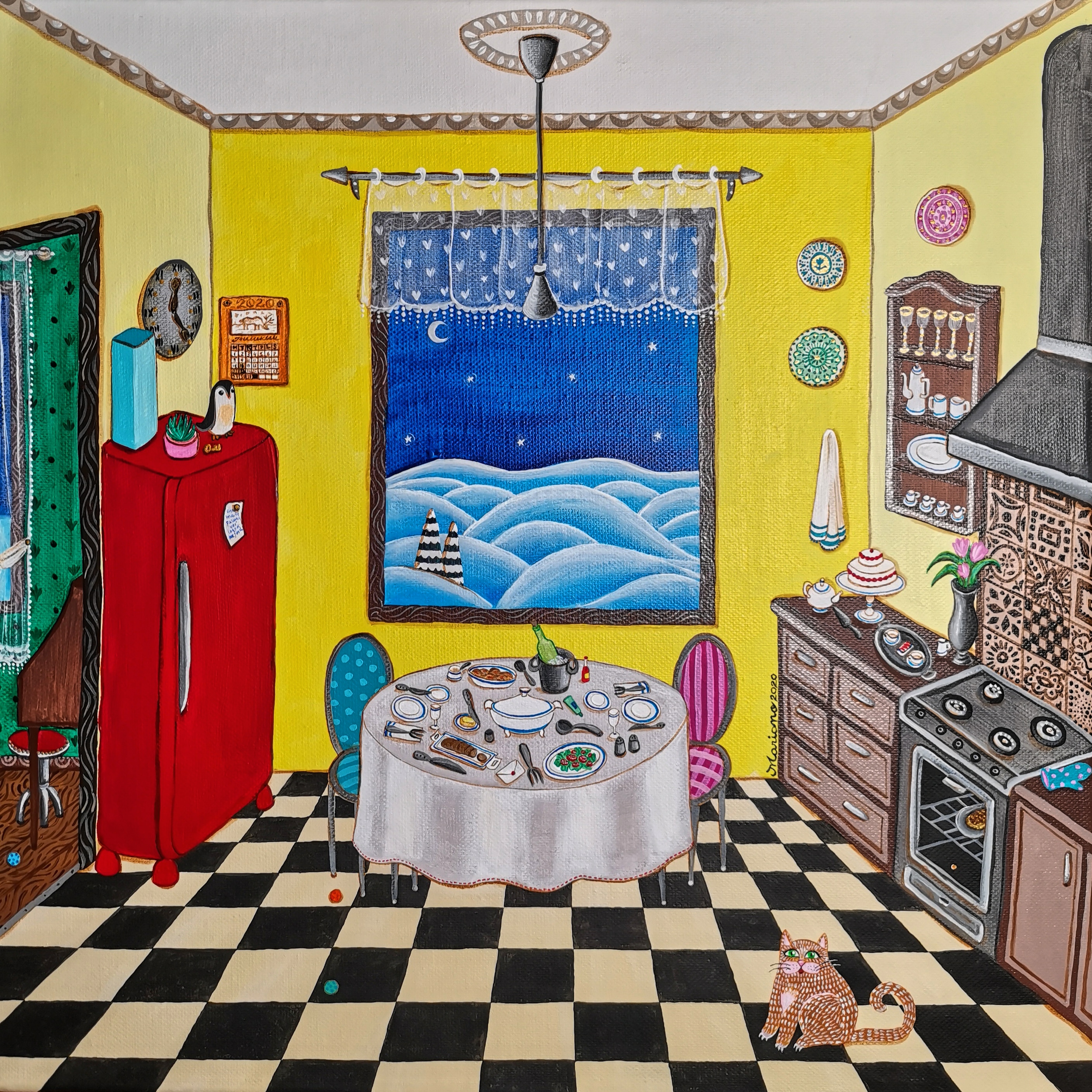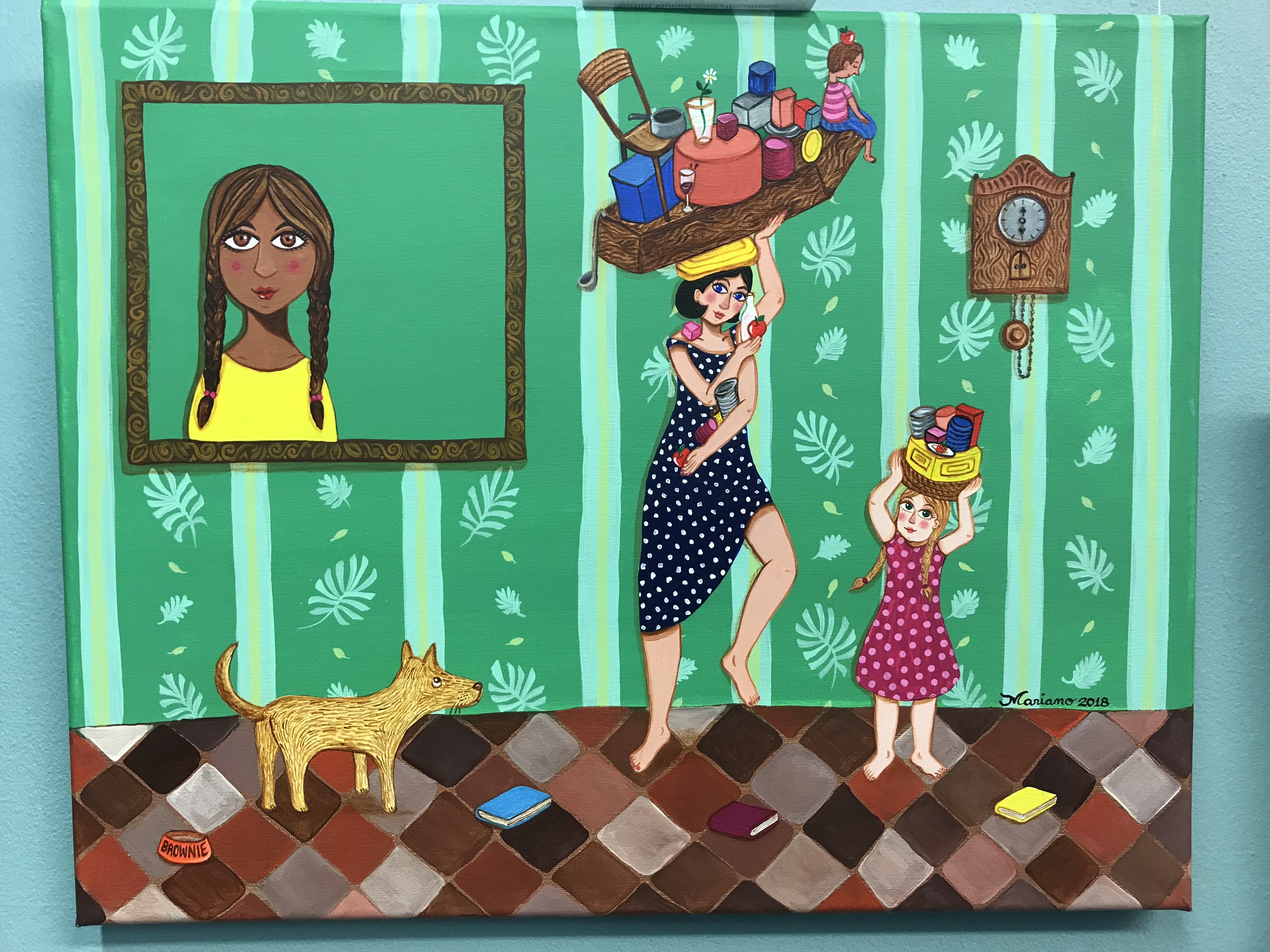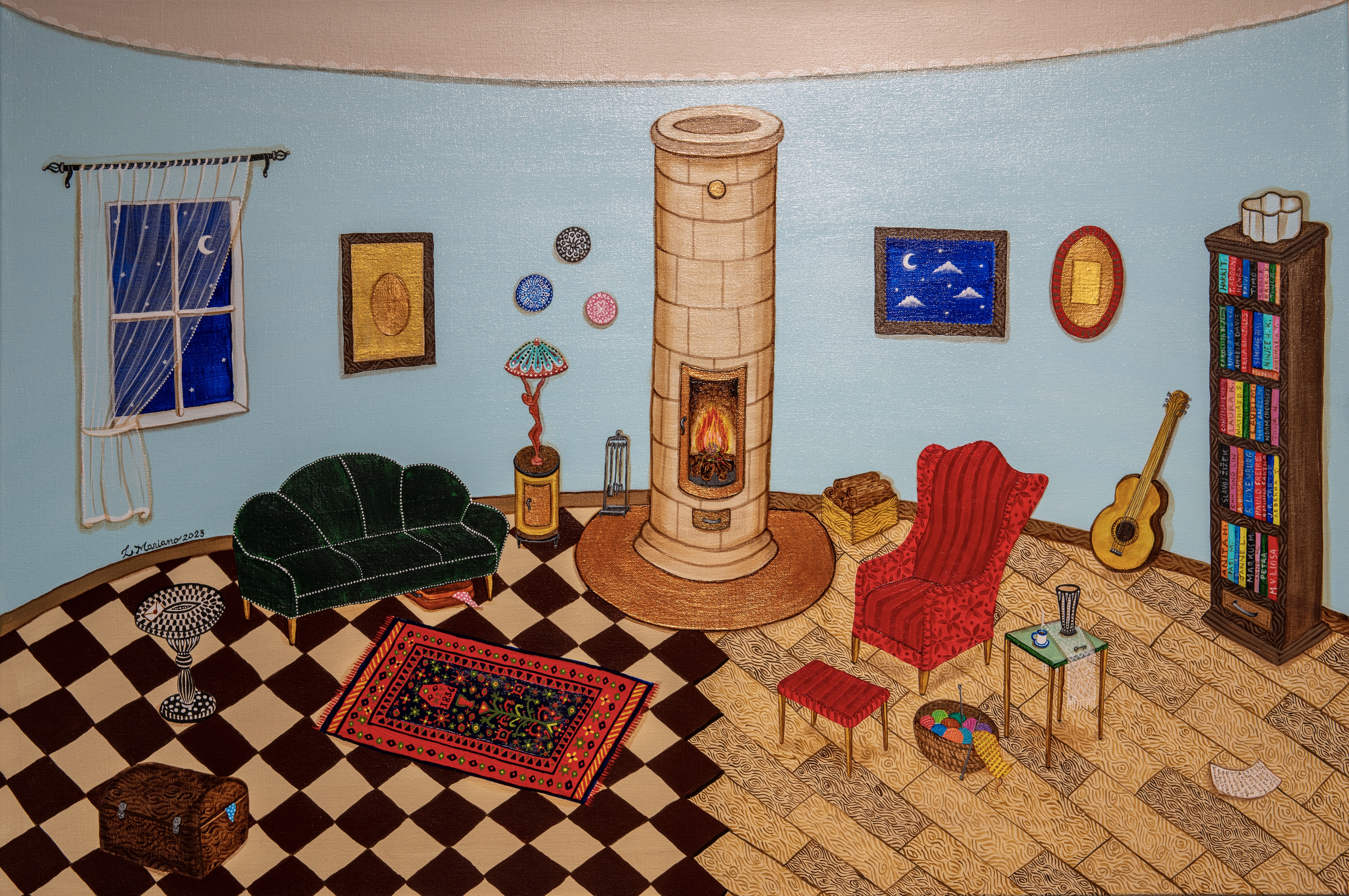 The 5th work of the immigration series is called “Finding balance”. Major life changes provoque unbalance. Immigrating requires a change of mind-set, search and understanding of the new reality. The new structure may seem confusing and the ways to function in society may need adjustments. Language, culture, clima, everything will challenge your adaptability. The door is half open and you never know what it may hold behind it. The scene is simple; door, table, different chairs where perhaps one can sit for a while and find some guidance or figure out the silence. On the walls 2 paintings: the waters look straight while the firm ground looks unbalanced. Small details and overwhelming feelings. All stages of a major change or immigration is a vast and uncomfortable ecossistem of feelings. Can you relate?