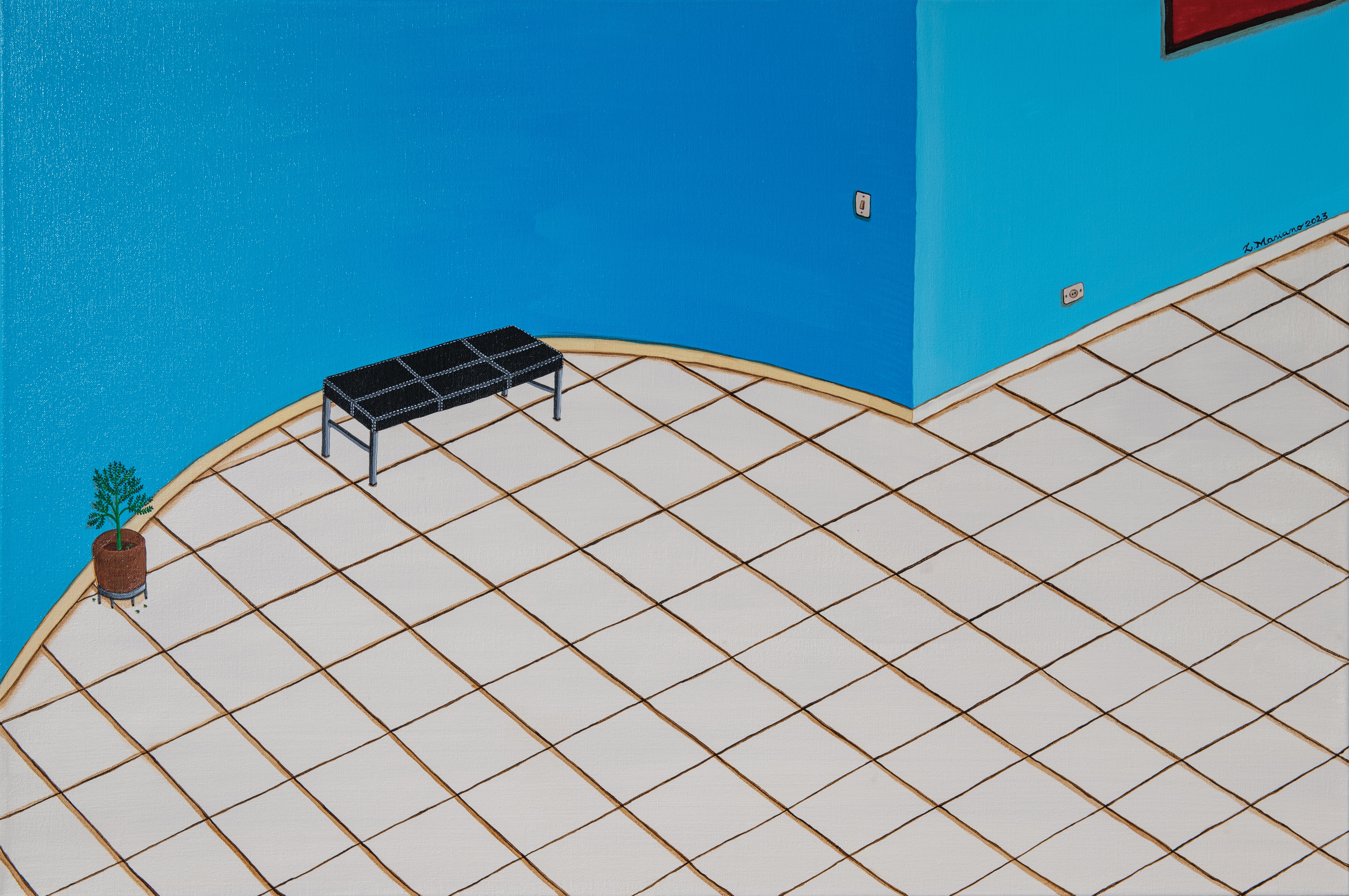 The 6th painting of this series is called “The corridors of bureaucracy”. This work is about the bureaucracy of things when you are already facing processes of change. Besides the material and emotional aspects of moving and adapting, immigration processes pile up a complicated barrier of rules, laws and papers, written in uncomprehensible and inaccessible words that require precision, knowledge, tranquility and patience, often not available in troublesome times. Demands energy and builds up the tension, amplifying the difficulties, doubts and unsecurities. The bureaucratic aspects of immigration are usually not the most difficult but is certainly one of the most stressful. It treats you as a standardised object to be in accordance with the demanded rules. It reduces humans to check lists of compliances. Bureaucratic environments are intimidating, sterile, not welcoming. Long corridors with unfamiliar faces, endless demands and unpredictable resolutions. You must walk it through if you want to overcome it. But at the end, there are no certainties nor guarantees for actually making it. You can´t really avoid it, it is a test for resilience. Uncomfortable and unavoidable growing pains, found on every little corner of the long winding road we call life.