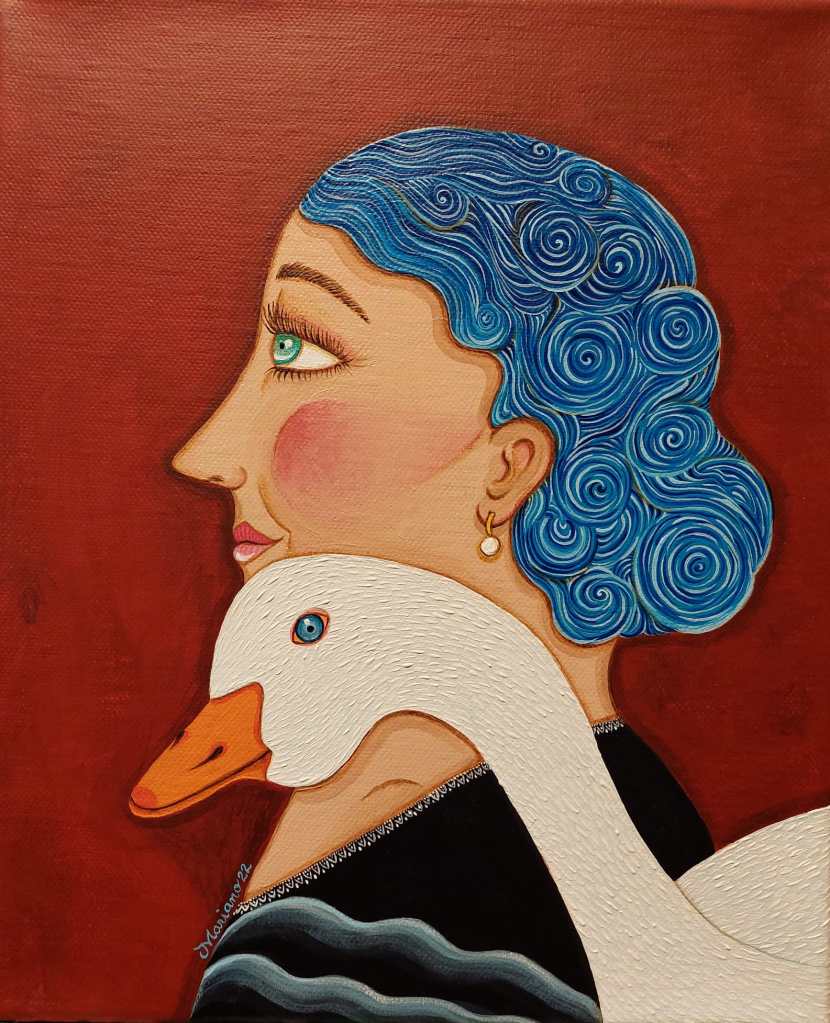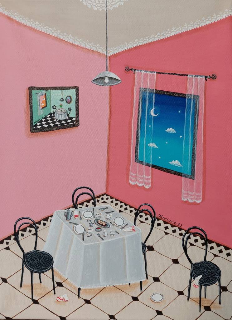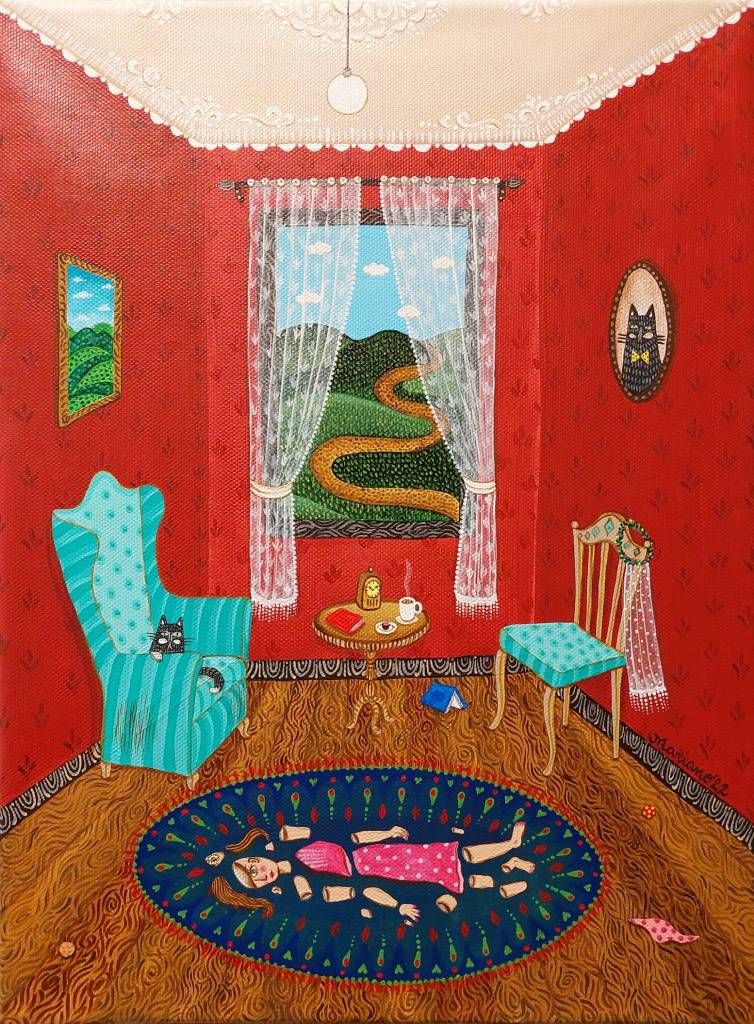 Self-taught artist, naïve, outsider, illustrator, feminist. Born in São Paulo, Brazil, based in Finland since 2018. Her paintings reflect an inner state of mind, empty spaces, tiny details, elements of unrest, female universe with open narratives.