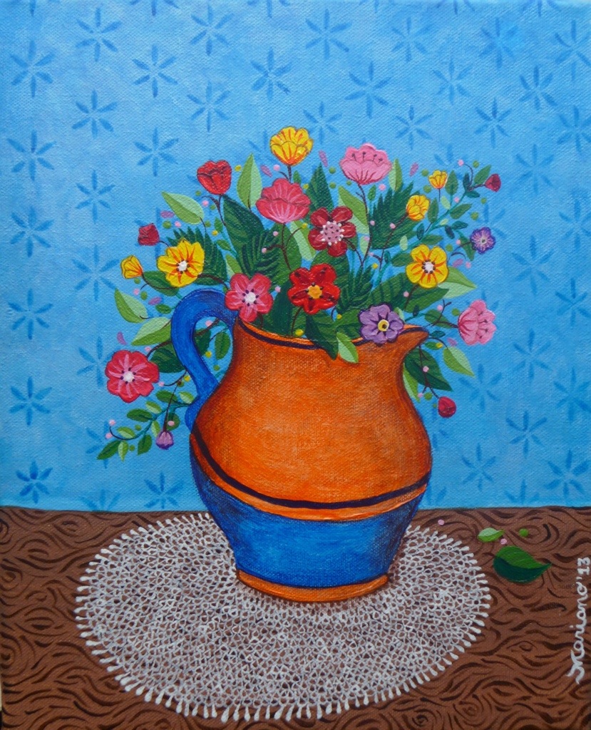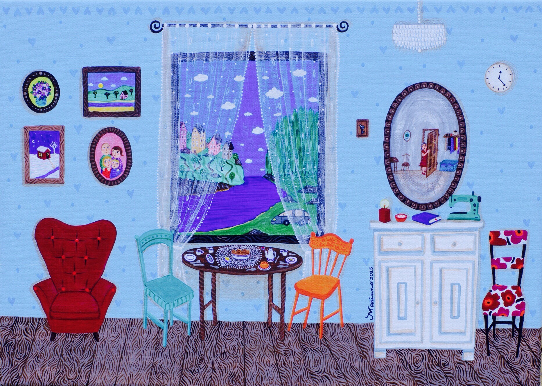 The 9th painting of this series is called “Living with differences”. Although this series was made during my residency at the Serlachius Museum Residency, and my reflection was done around the challenges of my own immigration to Finland, the paintings seem to me now reaching much wider comprehension about the matter. By the time I was producing them, I knew that the same concept could be shared in different situations of disruptive, such as a divorce, a change of jobs, house, city or even death. The current world situation brought my ponderations into a wider spectrum, where the political and cultural factors play also an important point of consideration. Living with differences means adapting. Also means allowing diversities to thrive together. It plays both in the individual, personal allowance to existence but also in the collective force, since we are all bound and connected in the same planet and we are the same species with a pleiad of diverse cultures, religions, contexts, stories. We cannot push others out of existence in order to exist without any discomfort nor disagreement. We cannot cease to be because others a claim the right to settle in. A war, in the 21st century, sounds to me that we are refusing to evolve as a society and as human beings. A genocide and a colonial mindset makes it all even more unreasonable, primitive, despicable. The painting shows the beauty and the ugliness in the possibility of allowing those differences to co-exist. But above that, it reinforces the idea of necessary and possible peaceful and comfortable co-existance. We can still thrive and be sheltered. Adapt and find balance. Allow and be granted with acceptance.