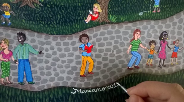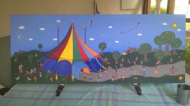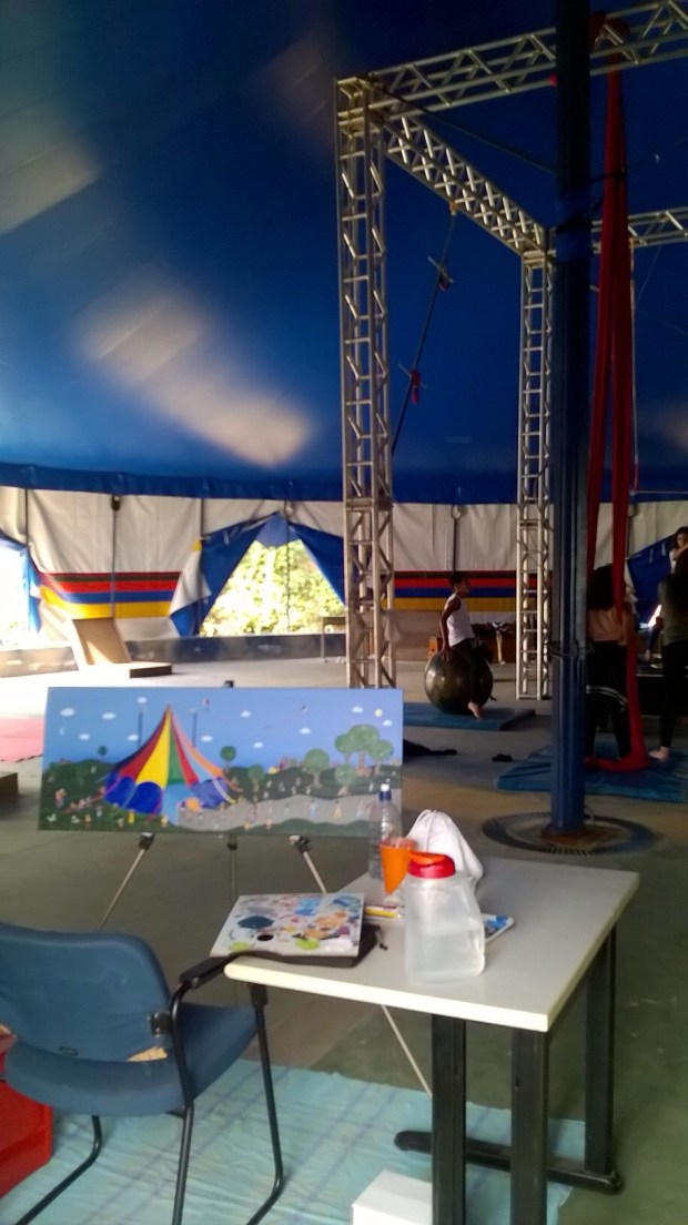 Durante uma semana inteira me sentei lá, sob a tenda de circo e pintei. Eu tinha centenas de olhos curiosos sobre mim. Eu estava cercada e assessorada por muitos parceiros, contadores de histórias, conselheiros, críticos, ajudantes. Eu respondi perguntas às quais eu nunca havia imaginado, ouvi comentários e elogios que eu nunca pensei que fossem possíveis ou sequer que existissem. Eu e minha pintura eram, diariamente, beijadas, abraçadas e carinhosamente acolhidas por centenas de crianças de 2 a 80 anos. Foi muito bom. Na verdade, eu acho que nunca havia sido tão amada.